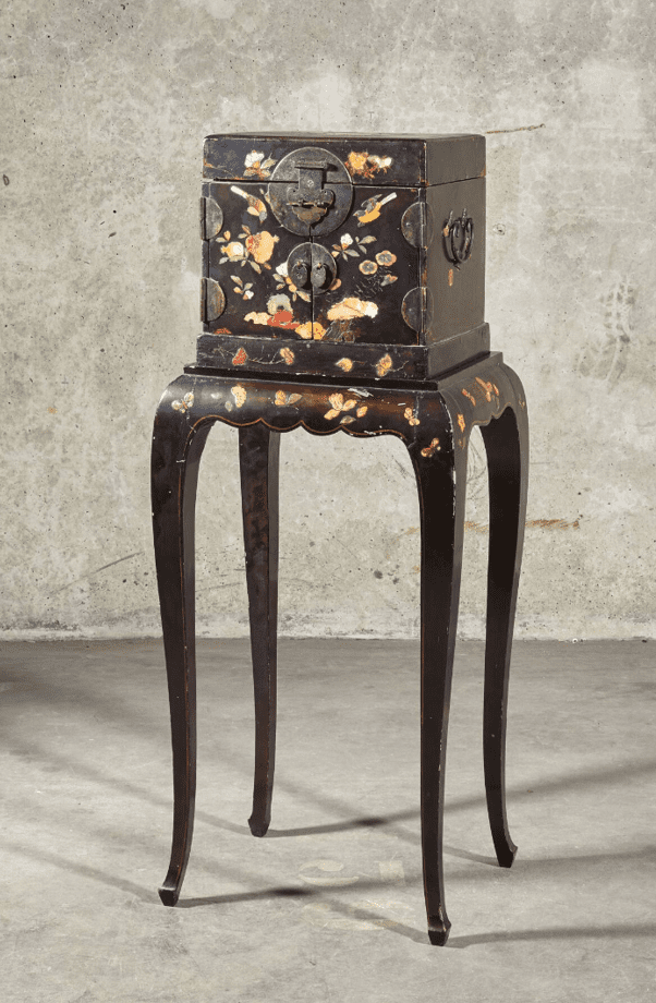 Cabinet (guanipixiang) en bois laqué sombre ouvrant par deux vantaux et un couvercle sur quatre tiroirs, à décor en incrustations de pierres dures et nacre d’oiseaux et fruits dans les fleurs et le rochers. les ferrures et prises en cuivre. (quelques manques, craquelures). Dim. 105,5 x 42 x 35 cm