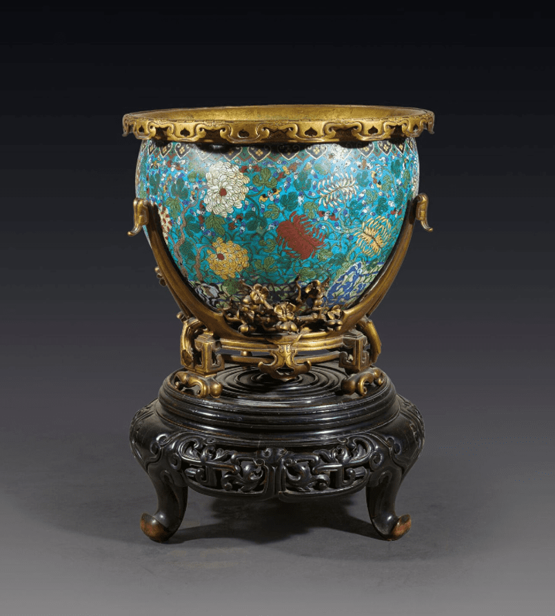 Grand aquarium en bronze doré et émaux cloisonnés à décor de rinceaux de pivoines et papillons surmontés d’une frise de ruyi. H. 52 cm Diam. 58 cm