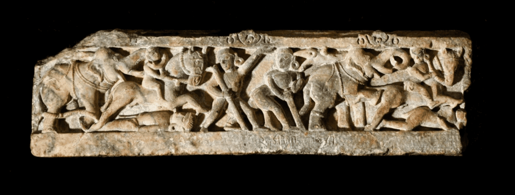 Fragment architectural en marbre, frise sculptées de scènes de combats du Ramayana, montrant la bataille de Lanka. (manques). Dim. 27 x 117 x 7 cm