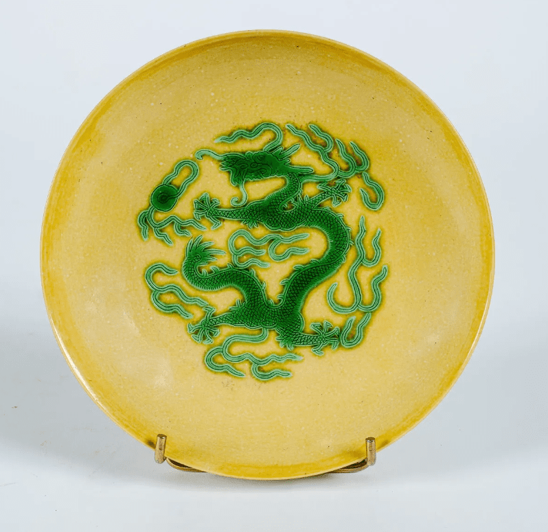 Coupe en porcelaine émaillée jaune et vert à décor incisé sous la couverte d’un dragon de face pourchassant la perle flammée, l’extérieur reprenant le même motif. Au revers, la marque de Guangxu en bleu sous couverte. (Fêlures). Diam. 18,8 cm