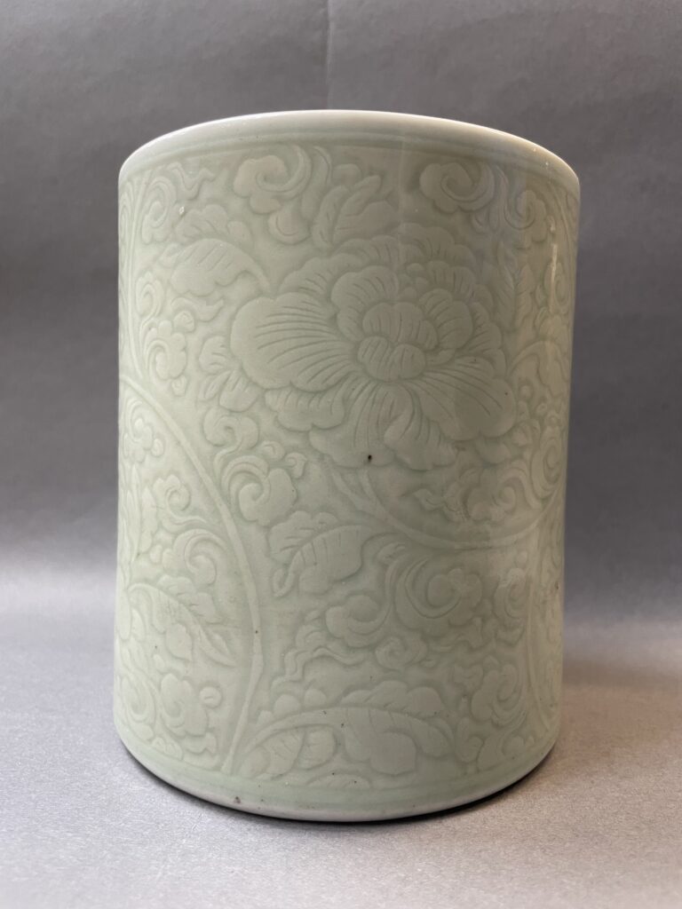 Pot à pinceaux (bitong) en porcelaine émaillée céladon à décor moulé sous la couverte de rinceaux de pivoines épanouies. (Petites égrenures) H. 13,9 cm Diam. 11,8 cm
