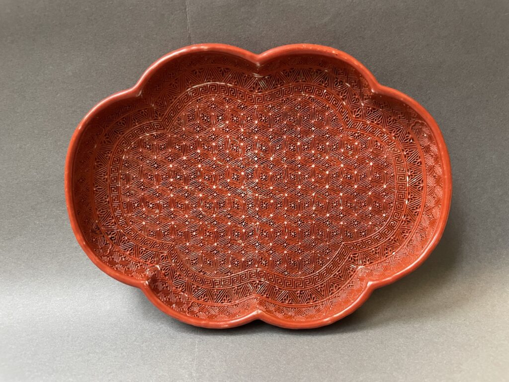 Plateau polylobé en porcelaine émaillée rouge imitant la laque à décor de sapèques et fleurettes. (Usures) L. 18 cm