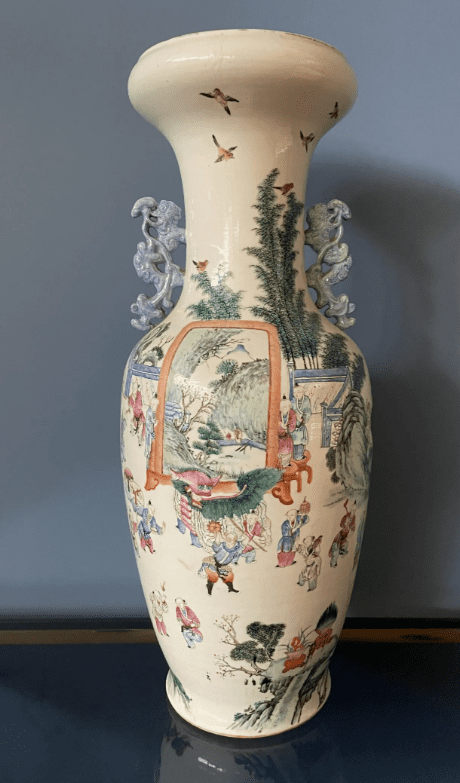 Grand vase balustre en porcelaine émaillée polychrome à décor d’enfants se déguisant pour la danse du lion dans un paysage. Deux anses en forme de branches de lingzhi. h. 60 cm