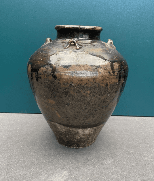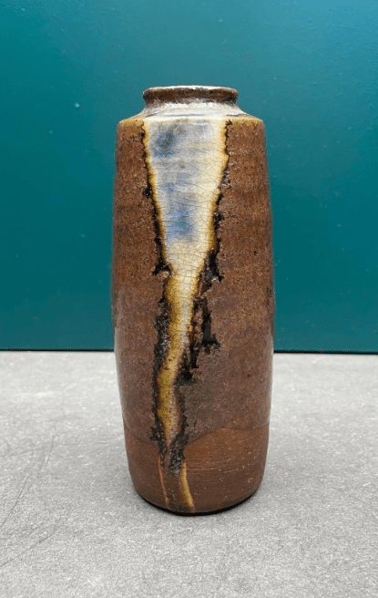 Chaïre (pot à thé) de forme cylindrique en grès brun émaillé brun légèrement irisé et coulures blanches bleutées. H. 16 cm