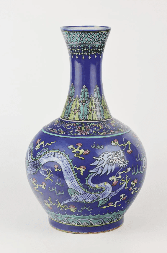 Vase de forme shangping en porcelaine émaillée polychrome dans le style de la famille rose de dragon dans les nuées pourchassant la perle flammée au-dessus des flots sur fond monochrome bleu, l’épaule ornée de rinceaux de fleurs et caractères ‘shou‘ (longévité) stylisés, le col à décor d’une frise de feuilles et pendeloques. Au revers, marque apocryphe de Qianlong. (Usures, défaut de cuisson, petit éclat au talon) H. 39 cm