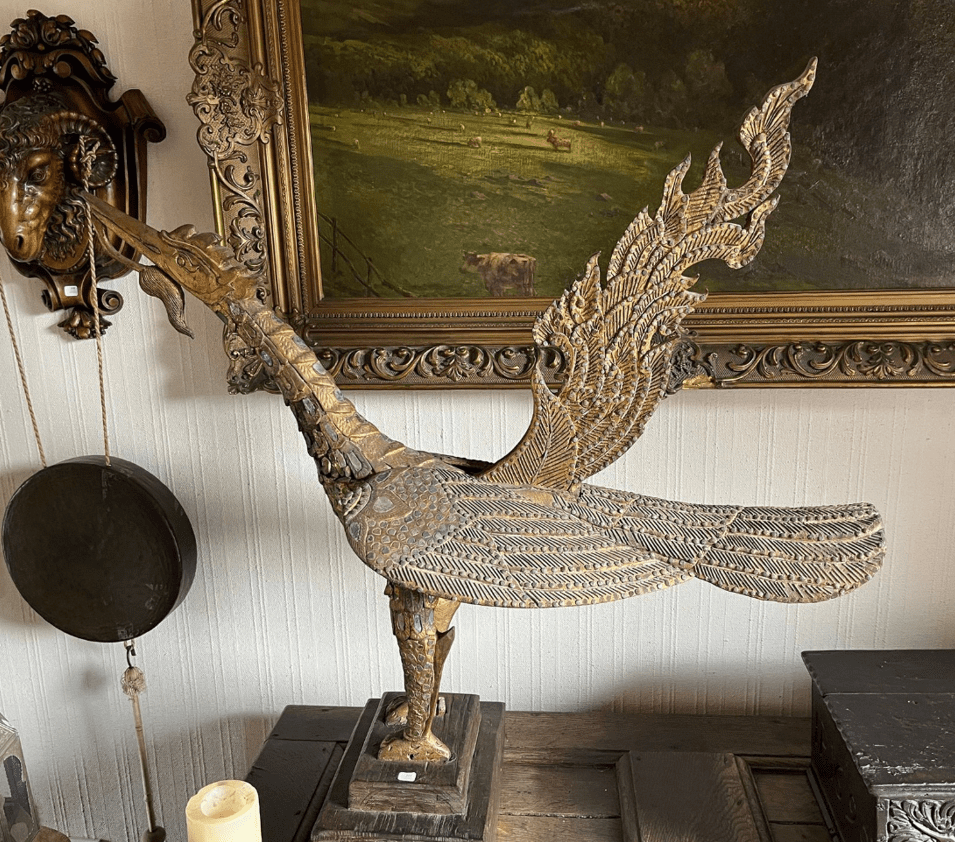 Oie (hamsa) en bois laqué or, les ailes rehaussées d’incrustations de verre, le cou tendu. H. 106 cm Socle en bois. Estimation 600/800 Euros