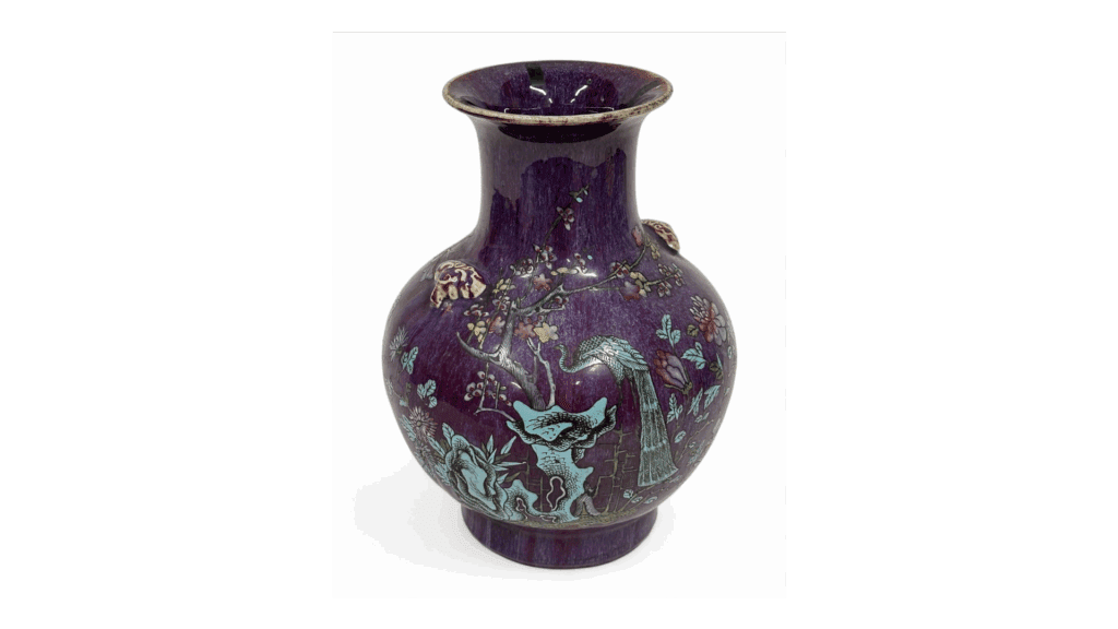 Vase de forme balustre en porcelaine émaillée violet flammé, l’épaulement orné de deux masques de taotie en relief. Surdécoré postérieurement en Europe d’un paon posé sur un rocher percé et fleuri de pruniers, et papillons volant dans les pivoines et lotus. Deux prises en relief en forme de papillon ajoutés sur l’épaule. (Choc). H. 33 cm Estimation 300/500 Euros