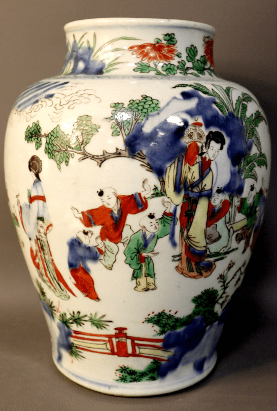 Potiche balustre en porcelaine à décor en bleu sous couverte et émaux rouge, vert, brun et jaune dit ‘wucai’ de femmes et enfants jouant dans un jardin, l’épaule à décor d’une frise de glace brisée, le col orné de rochers et pivoines.(Égrenures) H. : 39 cm