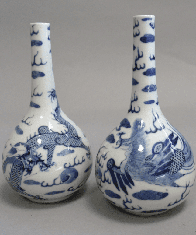 Paire de vases à décor de dragon et phénix chassant la perle, bleu de Hué. H. 20 cm Marque NOI PHU sous la base.