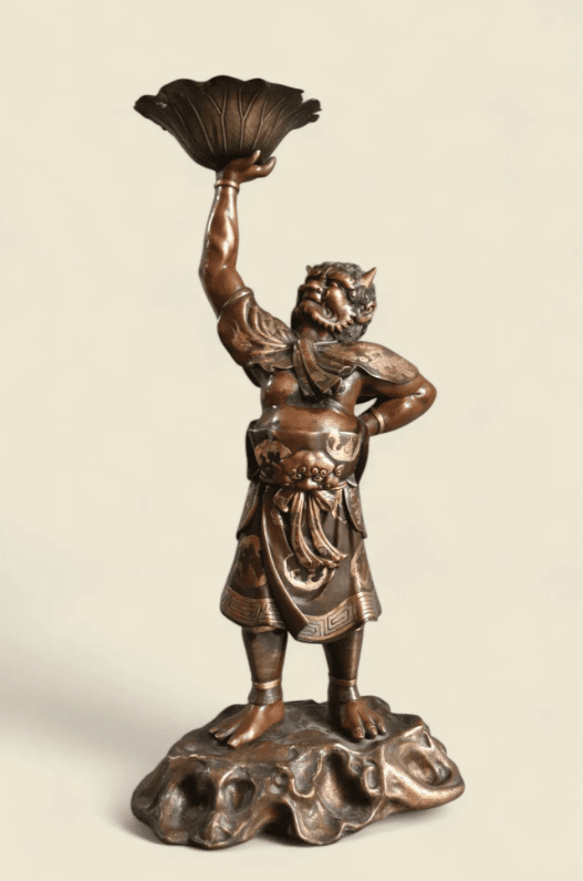 Grand okimono en bronze dépatiné, oni debout sur un tertre tenant de sa main droite une coupe en feuille de lotus. (Dépatiné). H.60 cm