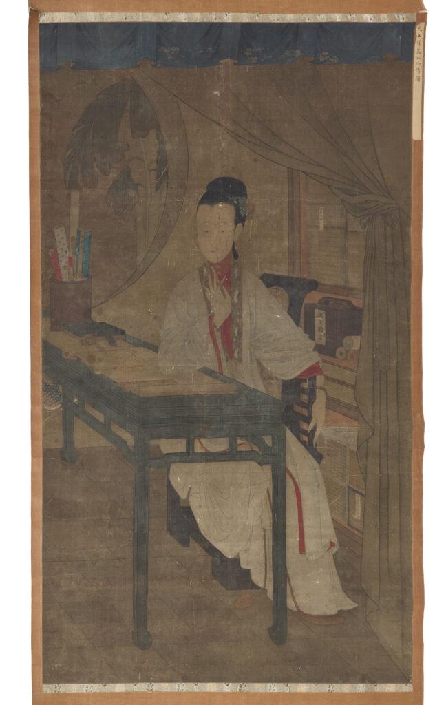 Encre et couleurs sur soie, représentant une jeune femme assise dans un bureau, tenant un pinceau à écrire un poème. Derrière elle, les étagères contiennent de nombreux ouvrages, parmi lesquels figurent Mingyuan shigui (anthologie de poétesses des dynasties passées), publiée sous la dynastie des Ming, ainsi que Shiti mingbian, compilé par Xu Shizeng sous la dynastie des Ming, et une boîte en bois conservant des objets en jade archaïques.