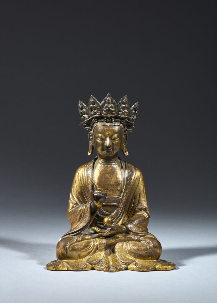 Statuette de bouddha en bronze doré, assis en padmasana, la main droite en karana mudra (geste de la protection du mal) et la main gauche tenant une perle. Il porte une robe monastique, la coiffe ornée d’une couronné comportant les cinq dhyanibouddha. H. 18 cm