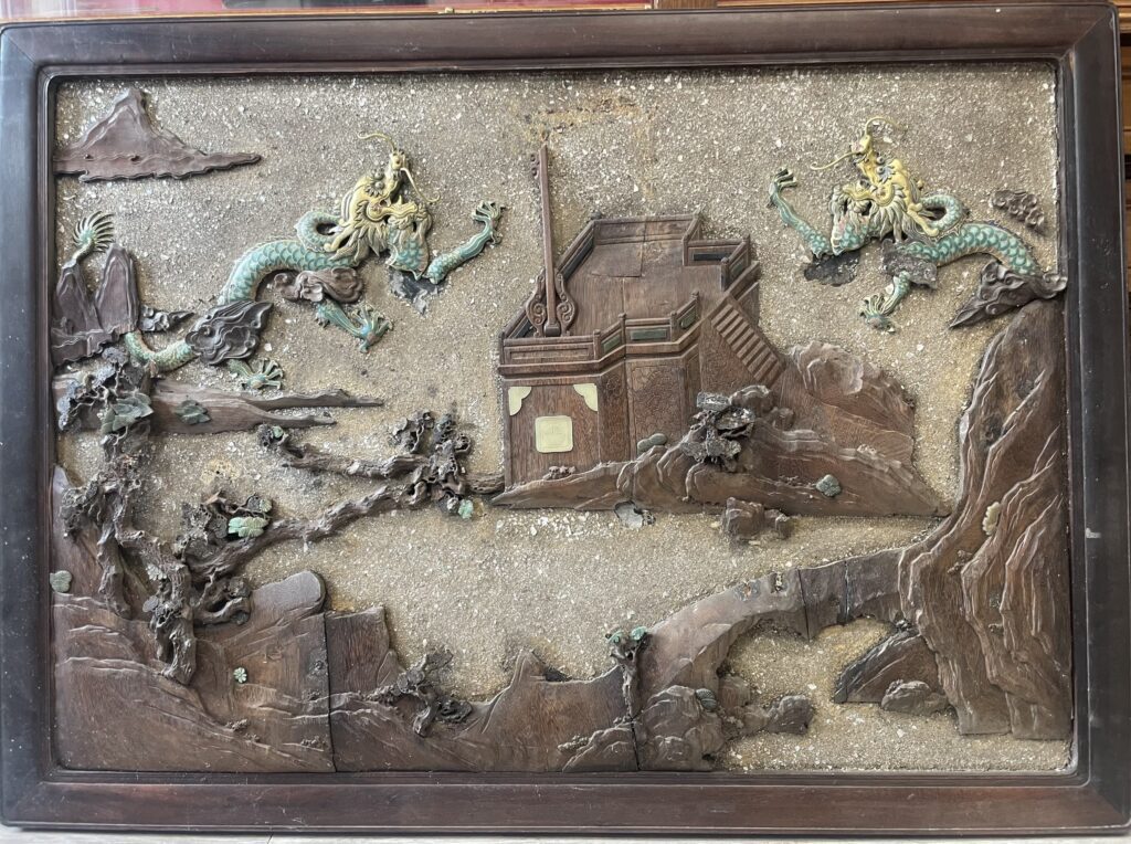 bronze cloisonnés en relief de deux dragons sur chaque panneau volant au-dessus de paysages montagneux ponctués de pavillons. Les yeux des dragons mobiles. L’arrière des panneaux à décor laqué or de chrysantèmes, rochers, bambous et papillons sur fond noir. (Manques et certaines incrustations détachées). Dim. sans les cadre 72,5 x 104,5 cmCadre en bois avec une anse mobile en bronze doré ciselé de rinceaux feuillagés formant lingzhi. (accident à un revers d’un des cadres). Dim. total: 84 x 116,5 cm.