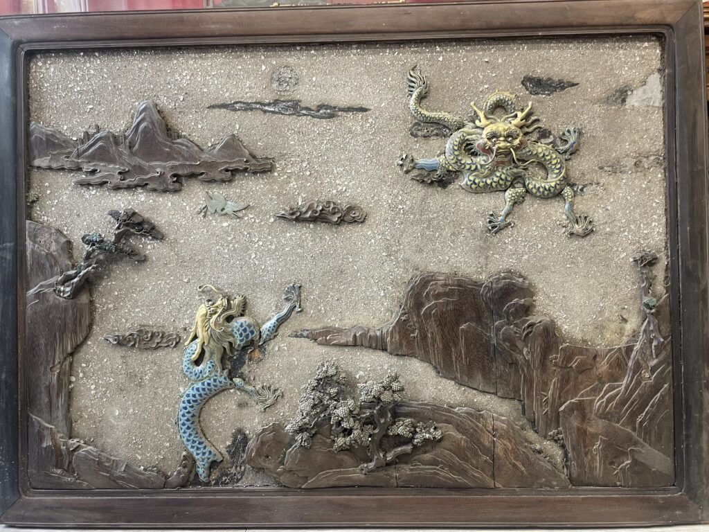 bronze cloisonnés en relief de deux dragons sur chaque panneau volant au-dessus de paysages montagneux ponctués de pavillons. Les yeux des dragons mobiles. L’arrière des panneaux à décor laqué or de chrysantèmes, rochers, bambous et papillons sur fond noir. (Manques et certaines incrustations détachées). Dim. sans les cadre 72,5 x 104,5 cmCadre en bois avec une anse mobile en bronze doré ciselé de rinceaux feuillagés formant lingzhi. (accident à un revers d’un des cadres). Dim. total: 84 x 116,5 cm.