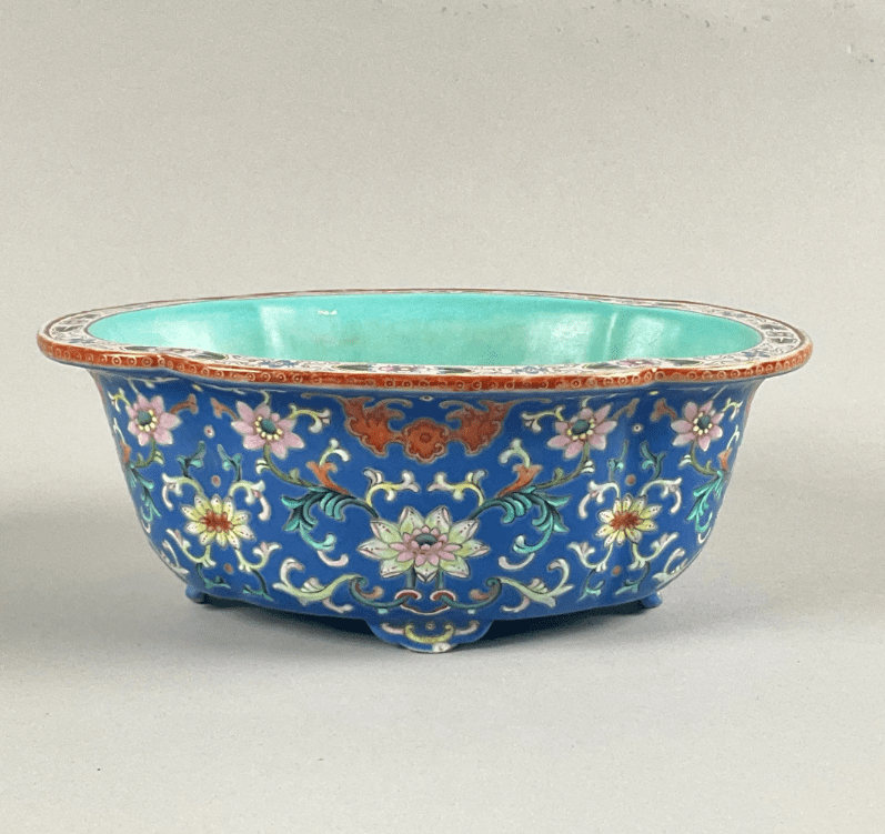Petite jardinière quadrilobée en porcelaine à décor émaillé polychrome et or de la famille rose de rinceaux de lotus sur fond bleu nuit, la lèvre aplatie à décor de rinceaux de fleurs et feuilles, reposant sur quatre pieds trilobés, l’intérieur émaillé turquoise. (Eclats aux pieds, fêlure traversante) L. 19,9 cm
