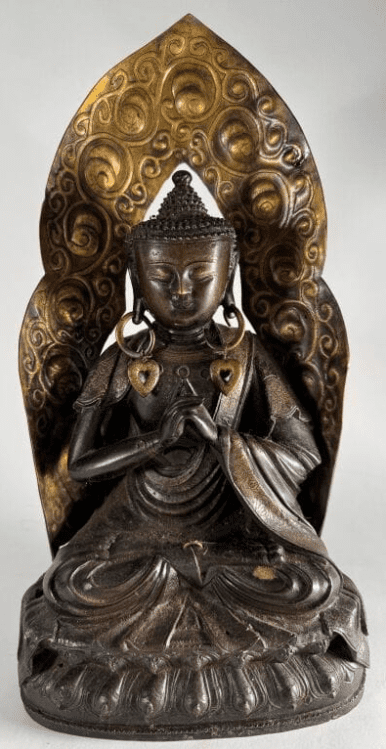 Statue de Vairocana en bronze à patine brune assis en padmasana sur un double socle lotiforme, les mains en Uttarabodhi mudra. (Trous, repercé en plusieurs endroits, éléments d’incrustations ajoutés, mandorle et boucles rapportés) H. 28,2 cm