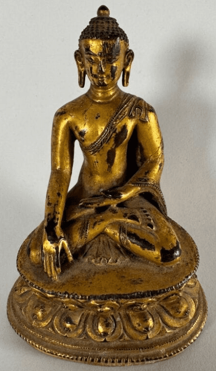 Statuette de bouddha en bronze doré, assis en vajra paryanka sana sur un socle lotiforme à double rangée de pétales, la main droite effectuant le geste de prise de la terre à témoin (bhumisparsa mudra). H. 14,4 cm