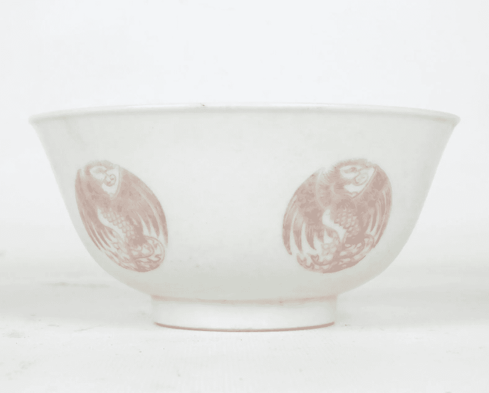 Bol en porcelaine à décor en rouge de cuivre sous couverte de médaillons de phénix aux ailes déployées. Au revers, la marque de Daoguang. (Fêlure). Diam. 14,9 cm