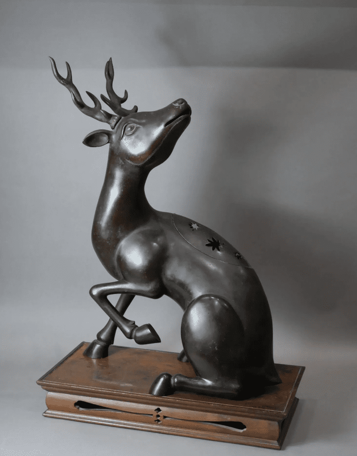 Grand daim en bronze à patine brune, assis formant brûle-parfum. Le couvercle sur le dos ajouré de feuilles d’érables (momiji ni shika), il a la tête tournée vers l’arrière. (Petits accidents). H. avec les bois 75 cm