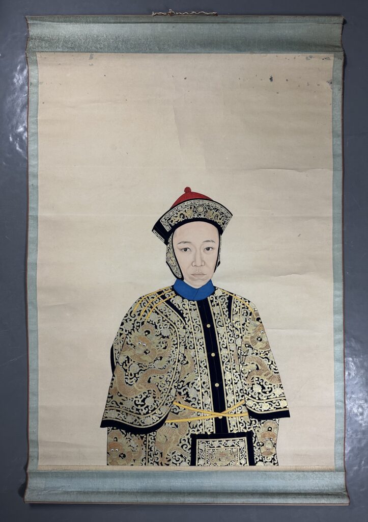 Monté en rouleau.Le portrait présenté lors de cette vente aux enchères est une peinture en couleur sur papier, représentant un jeune homme de la dynastie Qing en buste vêtu d’une armure.