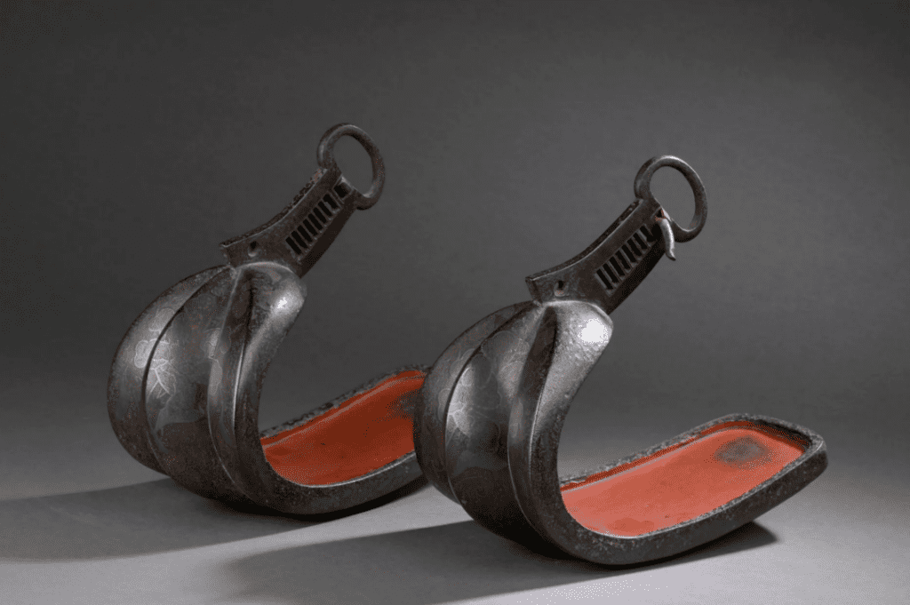 Paire d’abumi (étriers) en bronze à décor incrusté en hira zogan de shibuichi de pivoines épanouies, l’intérieur laqué rouge. L. 25,5 cm H. 24 cm