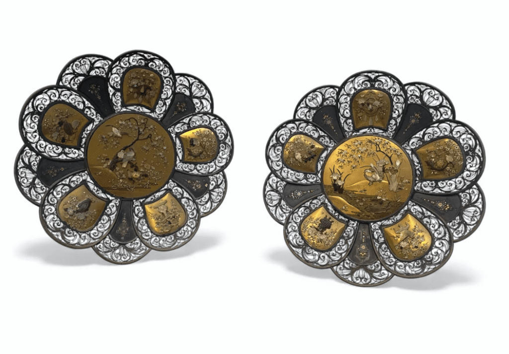 Paire de coupes tripodes en forme de fleurs en argent et laque or à décor incrusté de nacre et os au centre d’un couple de pigeon dans un prunier en fleurs et d’un couple de canards mandarins au bord d’un étang d’iris et carpe, les pétales en argent ajouré et en émaux cloisonnés de rinceaux de fleurs et à décor incrusté alternant paniers fleuris, cailles, faisan et héron dans les hibiscus, pivoines et glycines. Le revers en nashiji. Signé au revers Bimitsu. (Manques d’incrustations) Diam. 24,3 cm
