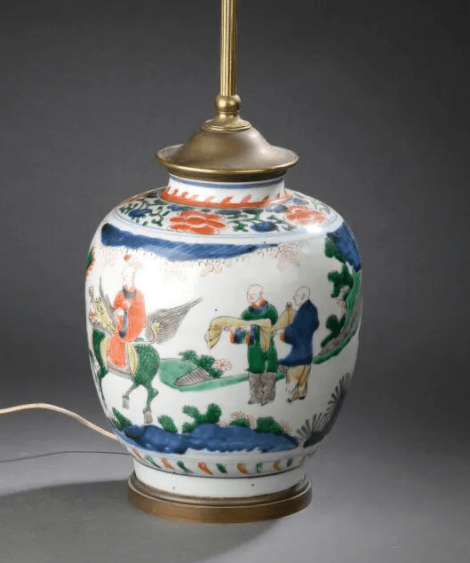 Pot à gingembre en porcelaine à décor en bleu sous couverte et émaux rouge, vert, aubergine et jaune d’immortel sur une qilin accompagné d’attendants portant des bannière et présents, l’épaule ornée d’une frise de rinceaux de pivoines. (Rayures, usures) H.23,5 cm Pied et col montés en bronze en lampe.