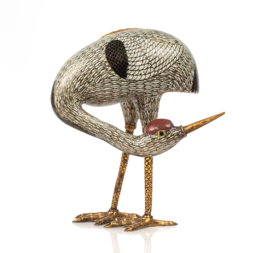 À l’origine, cette grue constituait, avec deux autres exemplaires, les trois supports d’un brûle-parfum, une transformation qui a probablement été réalisée par les ateliers de la maison Cartier, sous la direction de sa créatrice Jeanne Toussaint.