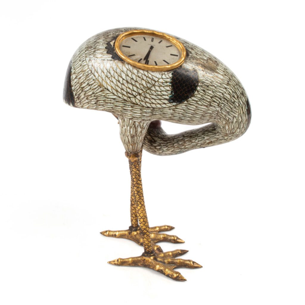 Grue en bronze doré et émaux cloisonnés, transformée en « montre » pour Jeanne Toussaint, le cadran signé Cartier Boîtier : figurée debout, le cou tourné vers l’arrière le long de son flanc gauche, les plumes finement dessinées et émaillées blanc et noir, les pattes en bronze doré incisé reposant sur ses quatre griffes palmées.